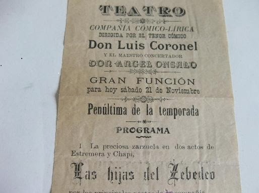 Se representó la zarzuela de los Maestros Estremera y Chapí titulada: "Las Hijas del Zebedeo" en dos actos ¡todo un clásico! El reparto no se lee en esta foto pero si en otra que tengo más grande, aunque los que sois de la familia podéis imaginároslo porque ahí salen varias sopranos de la familia como la abuela Pepa, y varios tenores de nuestra familia como el bisabuelo Luis y el tío-abuelo Manolo, su hermano Pepe que también tenía algún papel; y alguna de las chicas de nuestra familia García Martínez y/o allegadas. No os puedo contar los papeles que hacían porque no se lee por la calidad de la foto.